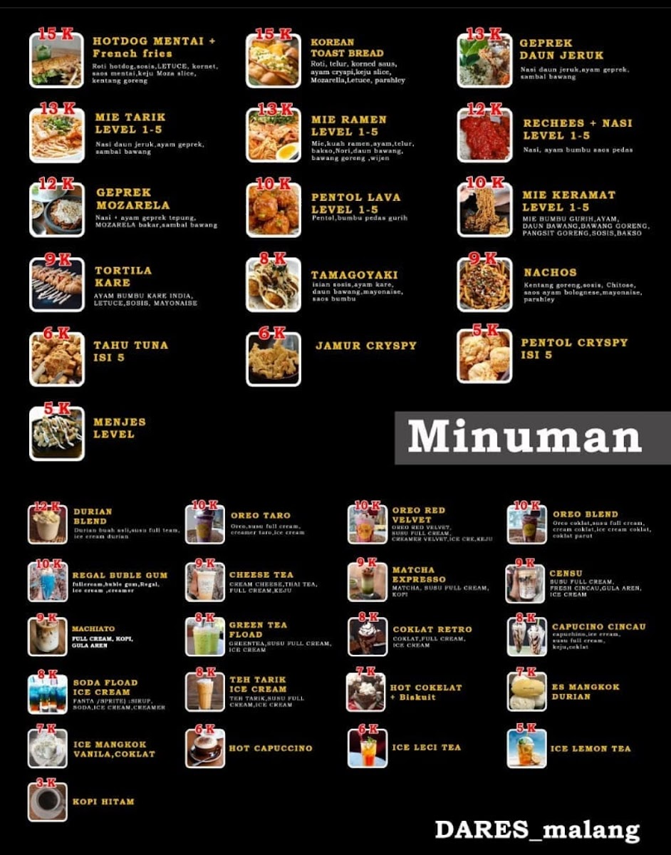 Welcome to Dares Cafe, the hidden gem nestled on Jl. Raya Tajinan in the heart of Tajinan, Malang. This vibrant cafe is not just a place to grab a bite; it’s a culinary haven that promises varied delights at incredibly affordable prices. If you're searching for an unforgettable experience that tantalizes the taste buds without breaking the bank, Dares Cafe should be at the top of your list!